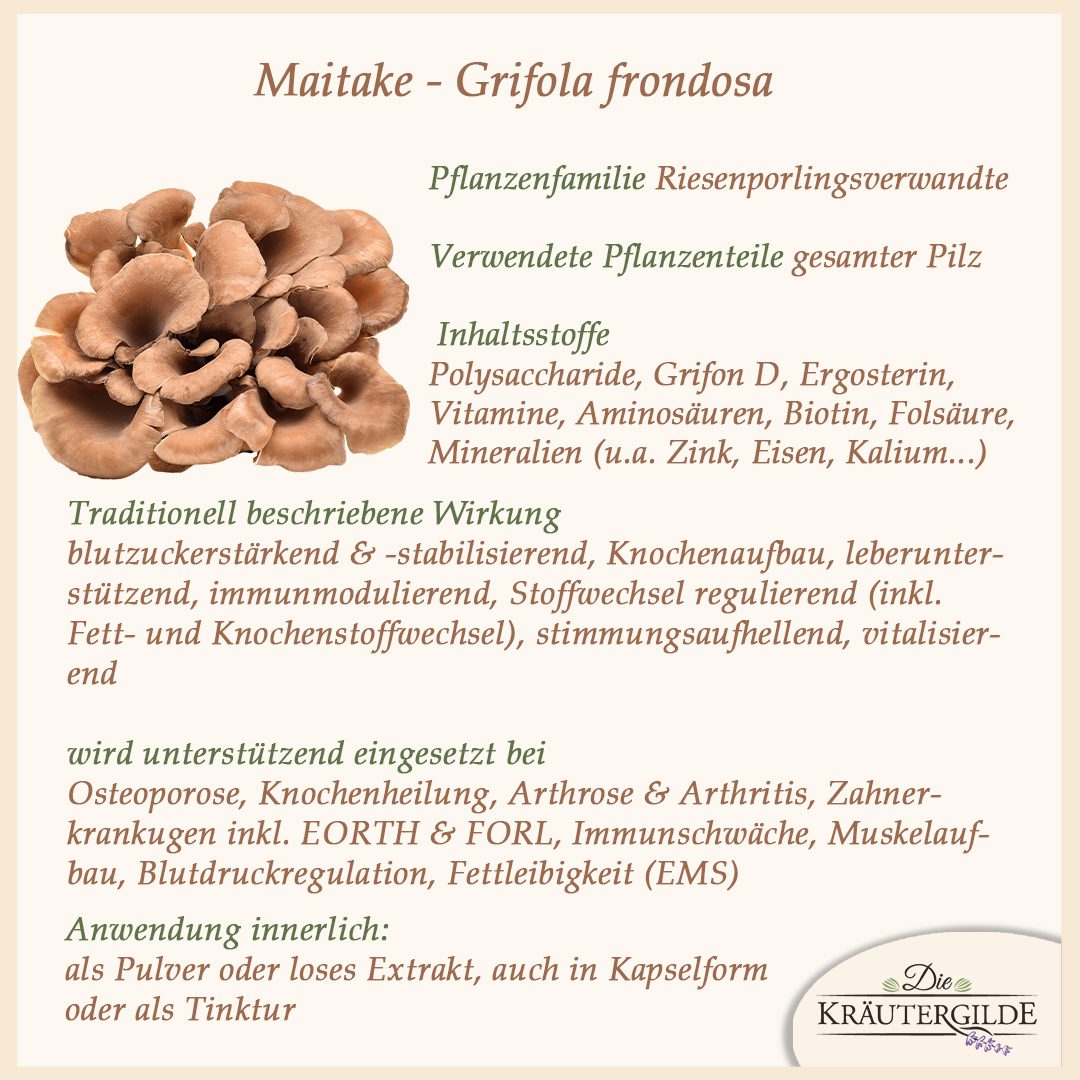 Hier stellen wir euch den Vitalpilz Maitake (Grifola frondosa) vor, der in der traditionellen Heilkunst hochgeschätzt wird. Der gesamte Pilz wird wegen seiner wertvollen Inhaltsstoffe verwendet, darunter Polysaccharide, Grifon D, Ergosterin, Vitamine, Aminosäuren, Biotin und Folsäure. Besonders bemerkenswert ist auch sein Gehalt an wichtigen Mineralien wie Zink, Eisen und Kalium.