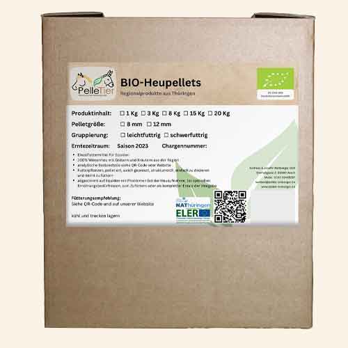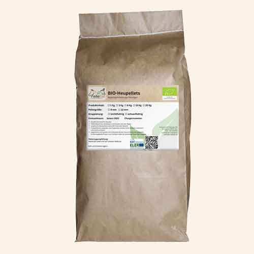 Einzelfuttermittel, Futterergänzung oder Raufutterersatz aus eigener Produktion mit lückenloser, nachweisbarer Verarbeitungskette von der Herkunftswiese bis in den Futtersack. Gräser und Kräuter stammen von artenreichen Thüringer Magerwiesen und werden während und nach der Blütezeit geschnitten. Die einschürige Mahd ab Mitte Juni garantiert geprüftes, faserreiches Heu. Durch den Erntezeitraum ist es in seiner Zusammensetzung auf Pferde, Ponys und Esel mit speziellen Ernährungsbedürfnissen abgestimmt. Die schonende Verarbeitung erhält die natürlichen Nährstoffe und ein angenehmes Duftaroma. Heupellets sind durch Erhitzung staubfrei, gereinigt und keimfrei.
