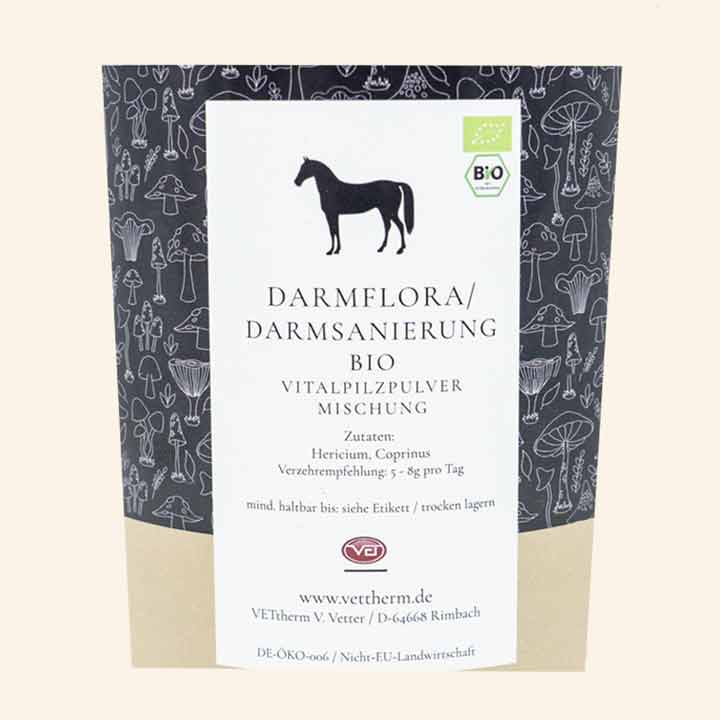 5 – 8g pro Tag bei ca. 600kg Pferd/Körpergewicht (1 Teelöffel entspricht ca. 3g Pilzpulver)