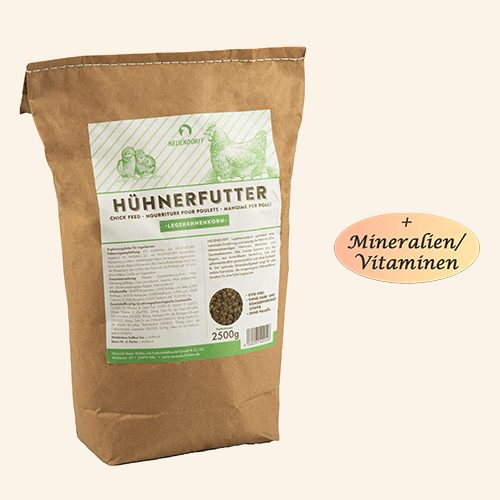 Wir empfehlen, das NEUENDORFF Legekorn im Verhältnis 2:1 mit NEUENDORFF Rassehühner Körnermix zu füttern. Idealerweise füttern Sie morgens Legehennen- korn und am Abend Körnermix.
